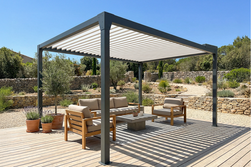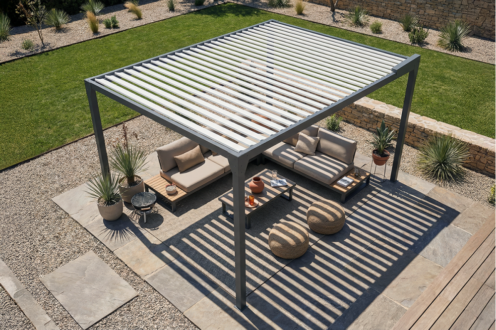 La pergola pas cher Jade vous offre la protection solaire d’une pergola bioclimatique à petit prix. Légère, elle n’en est pas moins robuste et sa manœuvre par treuil et manivelle permet de régler l’ensoleillement jusqu’à une ouverture des lames à 90°. Disponible en version îlot ou adossée, elle convient à toutes les terrasses ou jardins. Tout comme sur les modèles plus chers Agate et Améthyste, sa structure horizontale vous permet d’y ajouter des coffres latéraux pour gagner en intimité et protection.